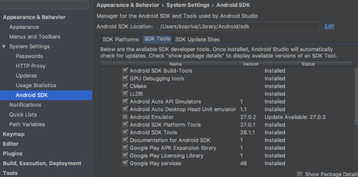 - Install Android SDK Command-line Tools (latest) from SDK Tools