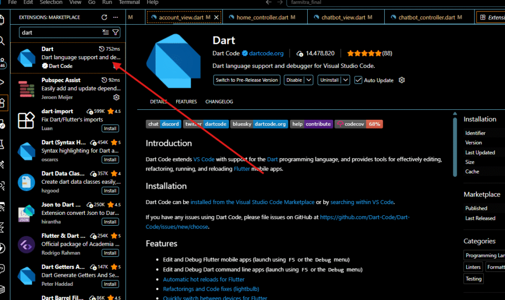 The Flutter extension usually works alongside Dart support, and the overall development experience is much smoother when both are installed.